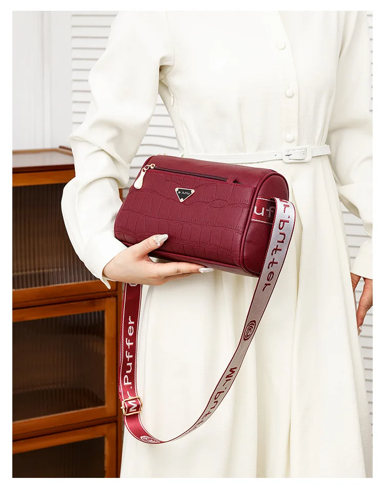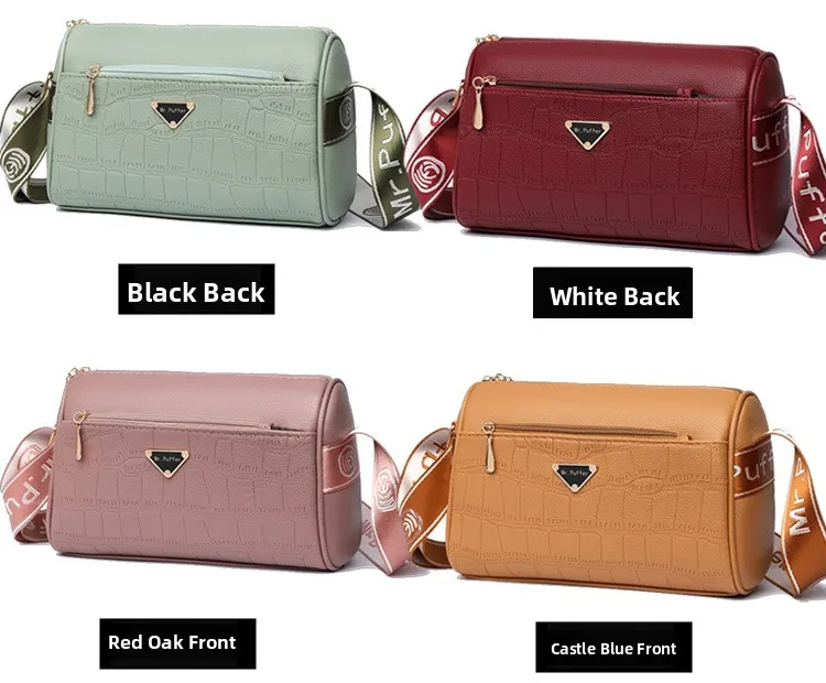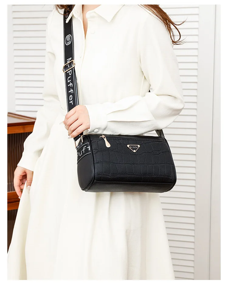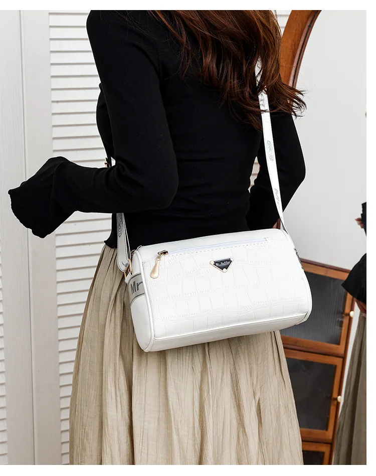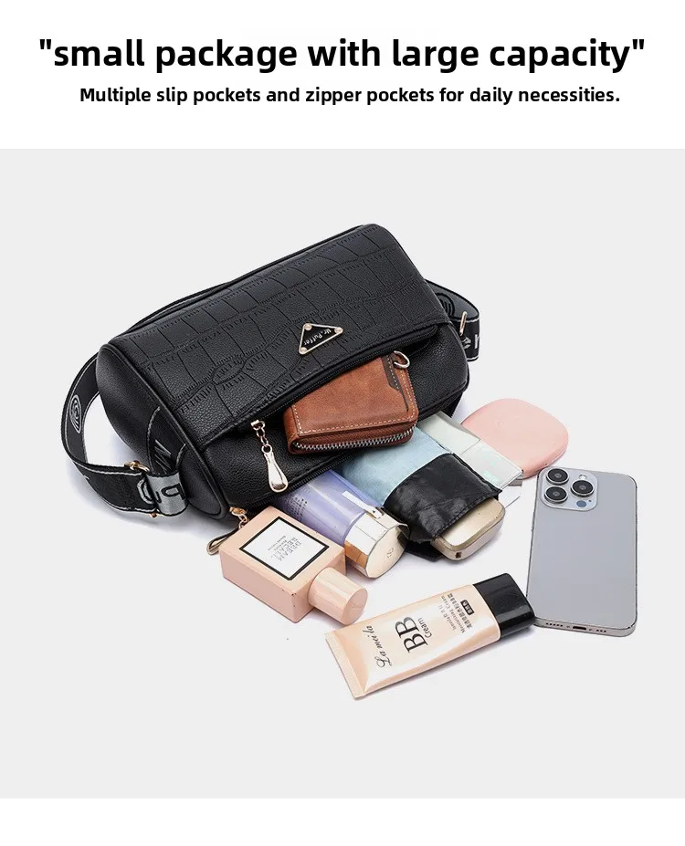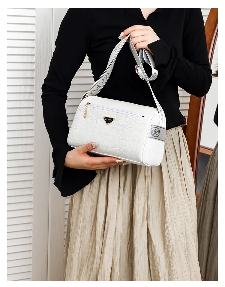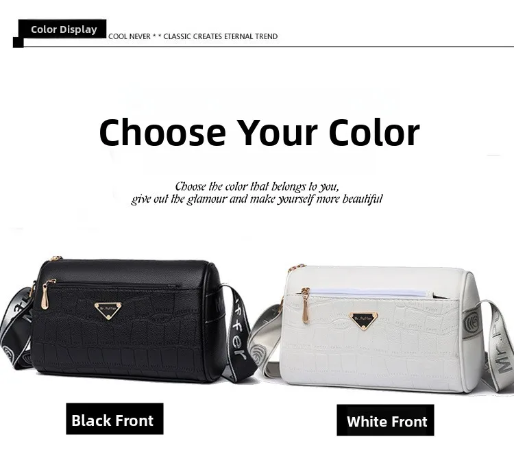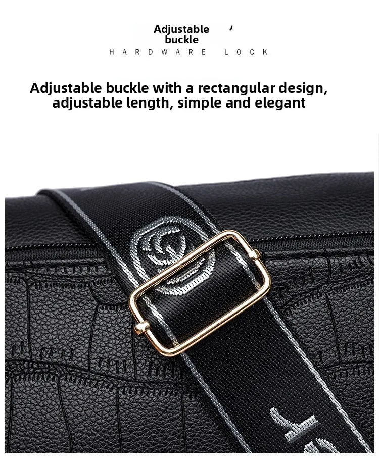 A bolsa incorpora elementos da moda como linhas de costura, padrões xadrez, textura de pele de crocodilo e designs em relevo, adicionando um toque de sofisticação ao seu visual.
