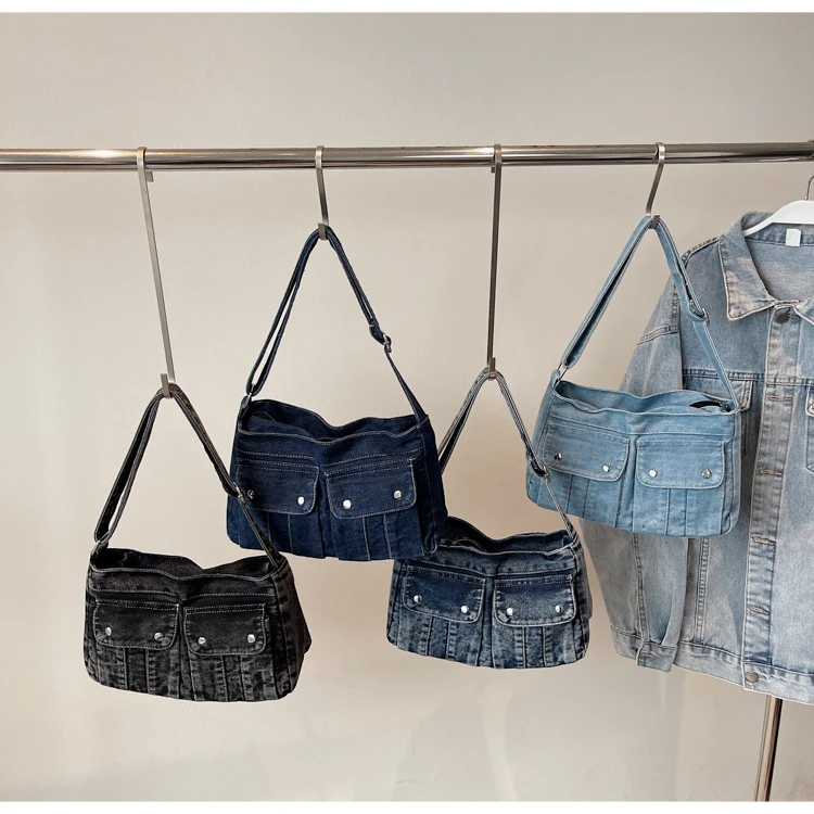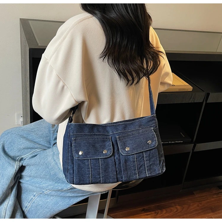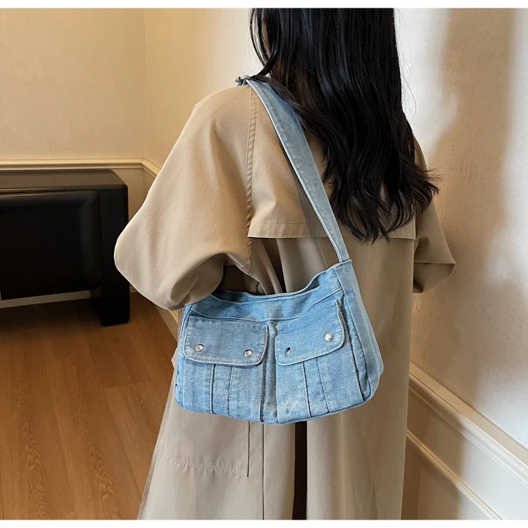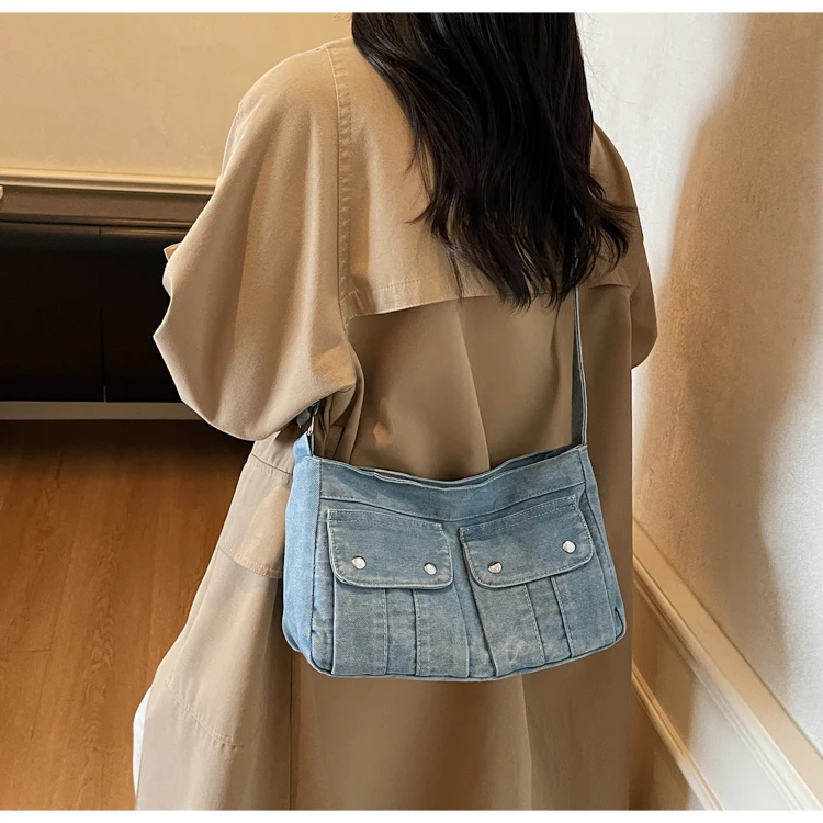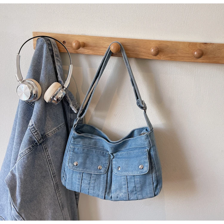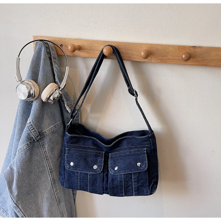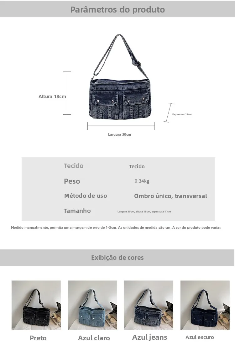 Este saco de mochila de jeans para mulheres apresenta um estilo casual simples, perfeito para uso diário.