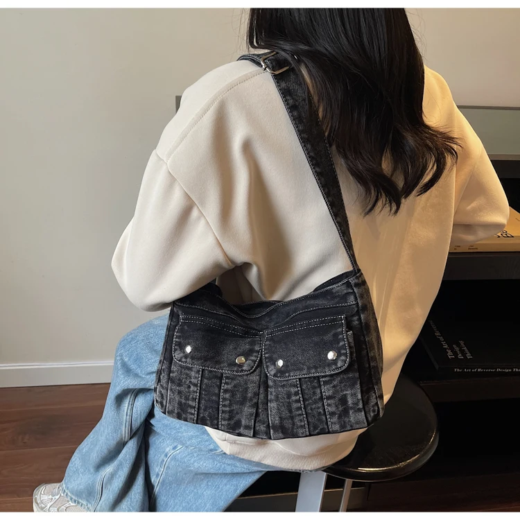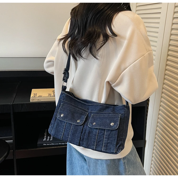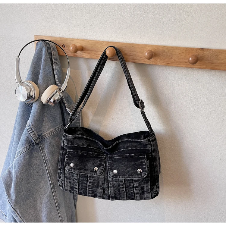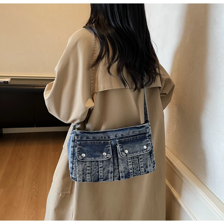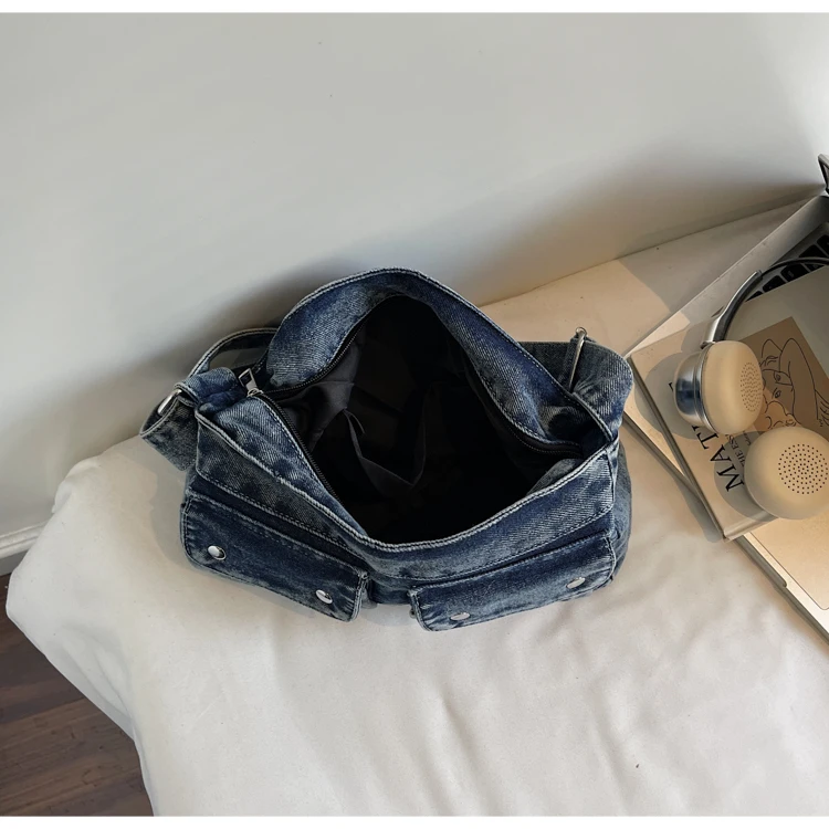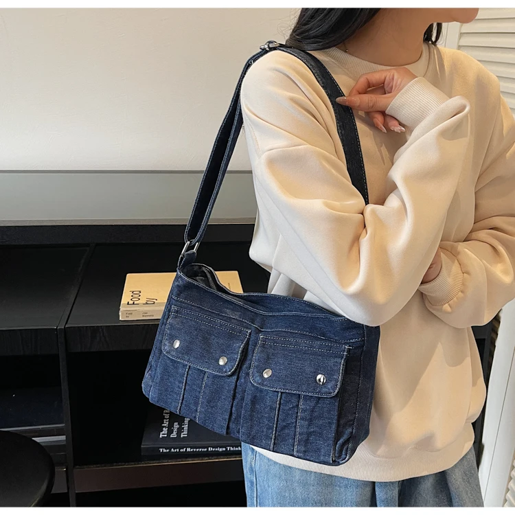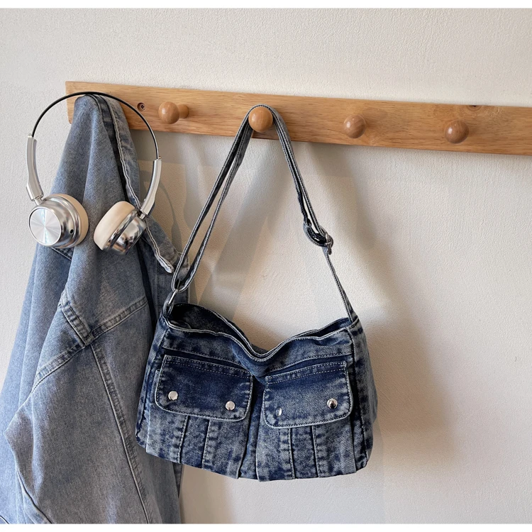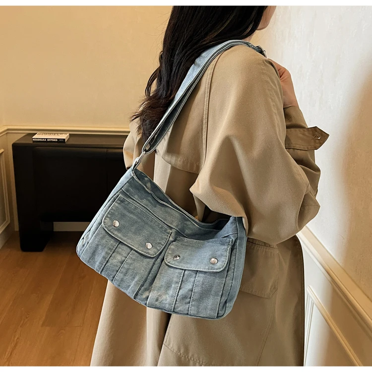 Este saco de mochila de jeans para mulheres apresenta um estilo casual simples, perfeito para uso diário.
