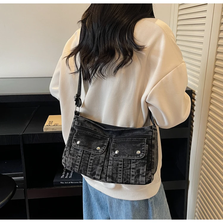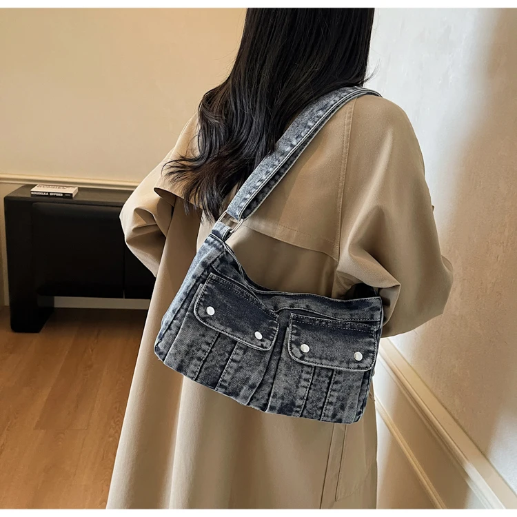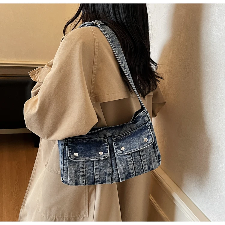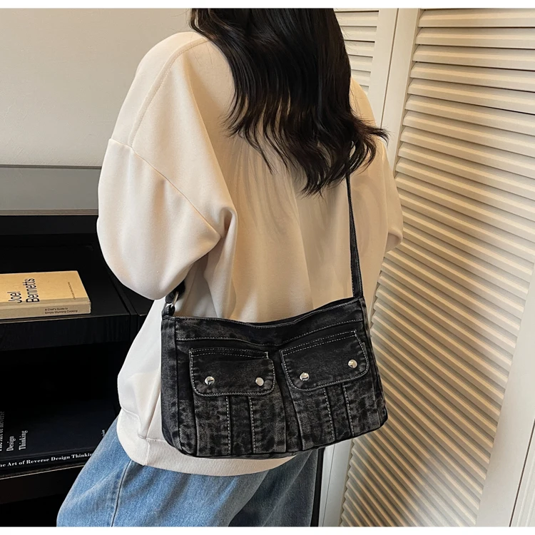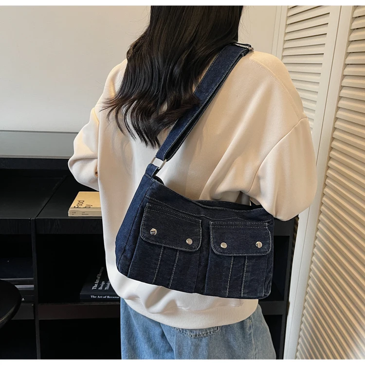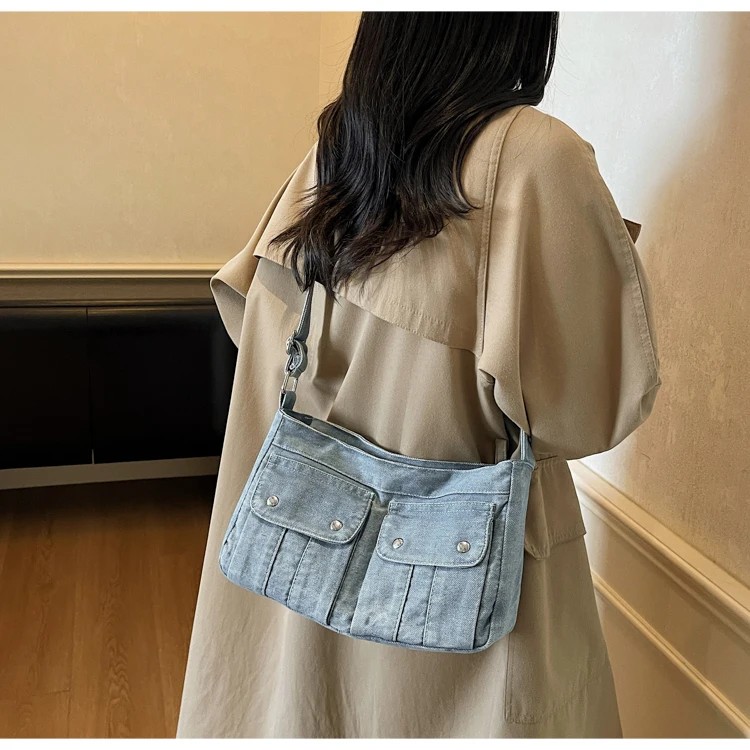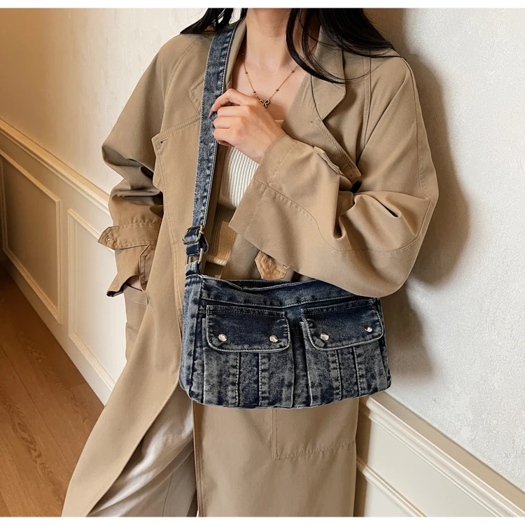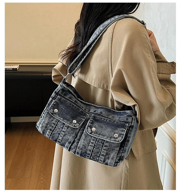 Este saco de mochila de jeans para mulheres apresenta um estilo casual simples, perfeito para uso diário.