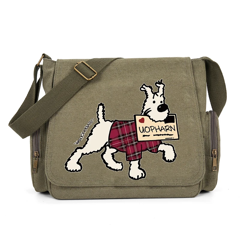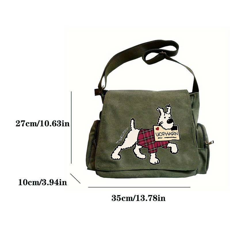 A estrela do show é o? Ilustração do cão UOPHARN?, que adiciona uma explosão de energia lúdica ao seu visual.Seu lenço xadrez vermelho brilhante e sua expressão alegre levantam instantaneamente seu ânimo, tornando esta bolsa um ponto de partida para uma conversa.Mas não se preocupe – esta vibração lúdica não compromete a elegância.A base de lona de oliva profunda é clássica e versátil, combinando facilmente com jeans casuais, roupas casuais elegantes ou até conjuntos semiformais.
