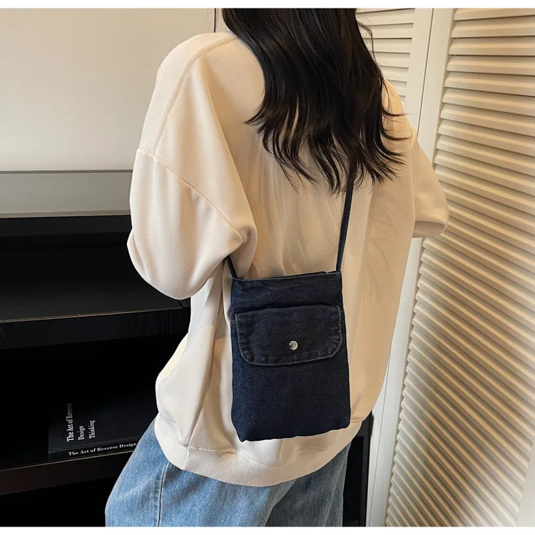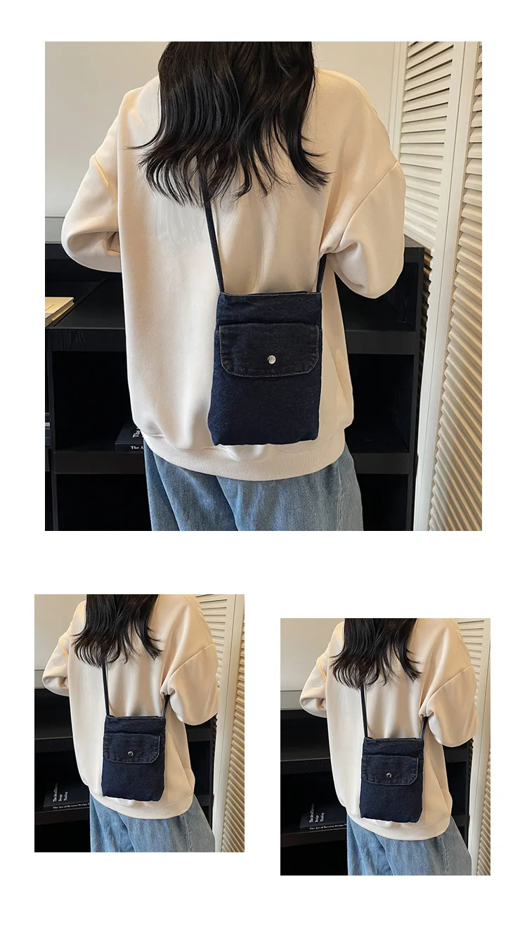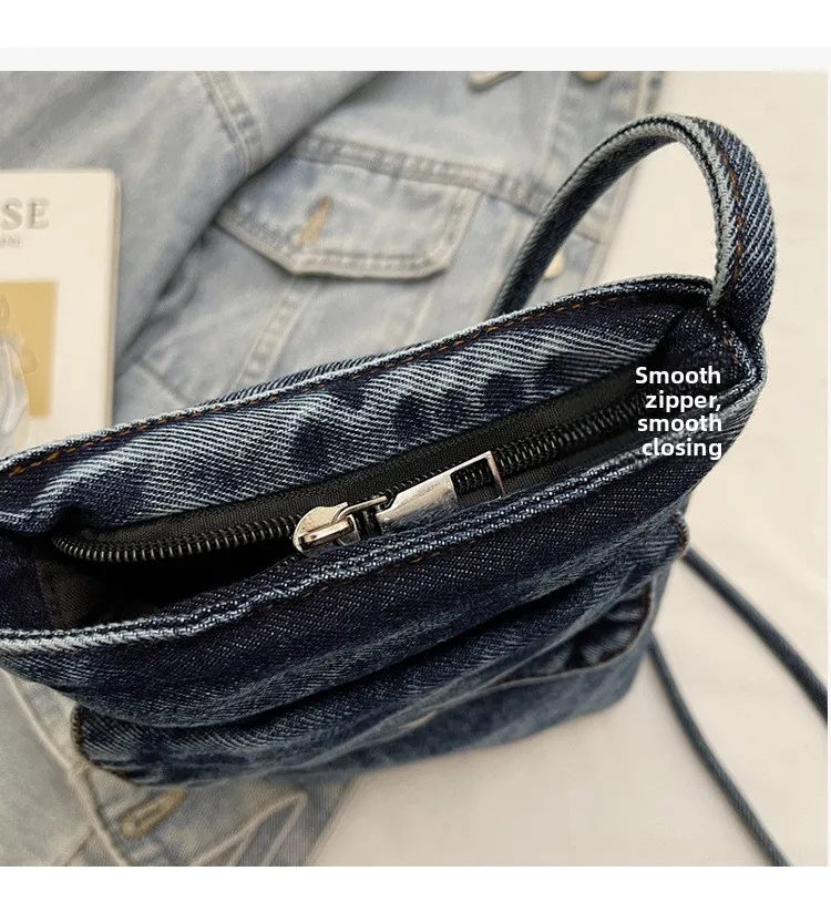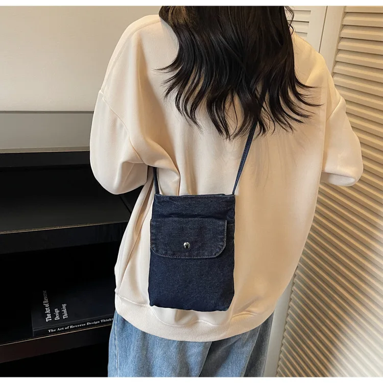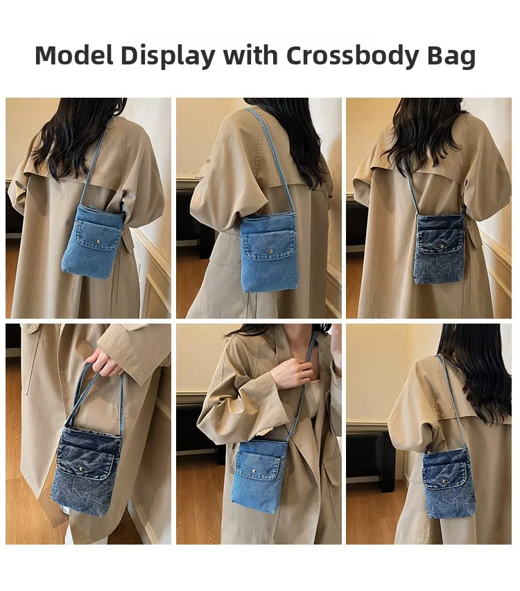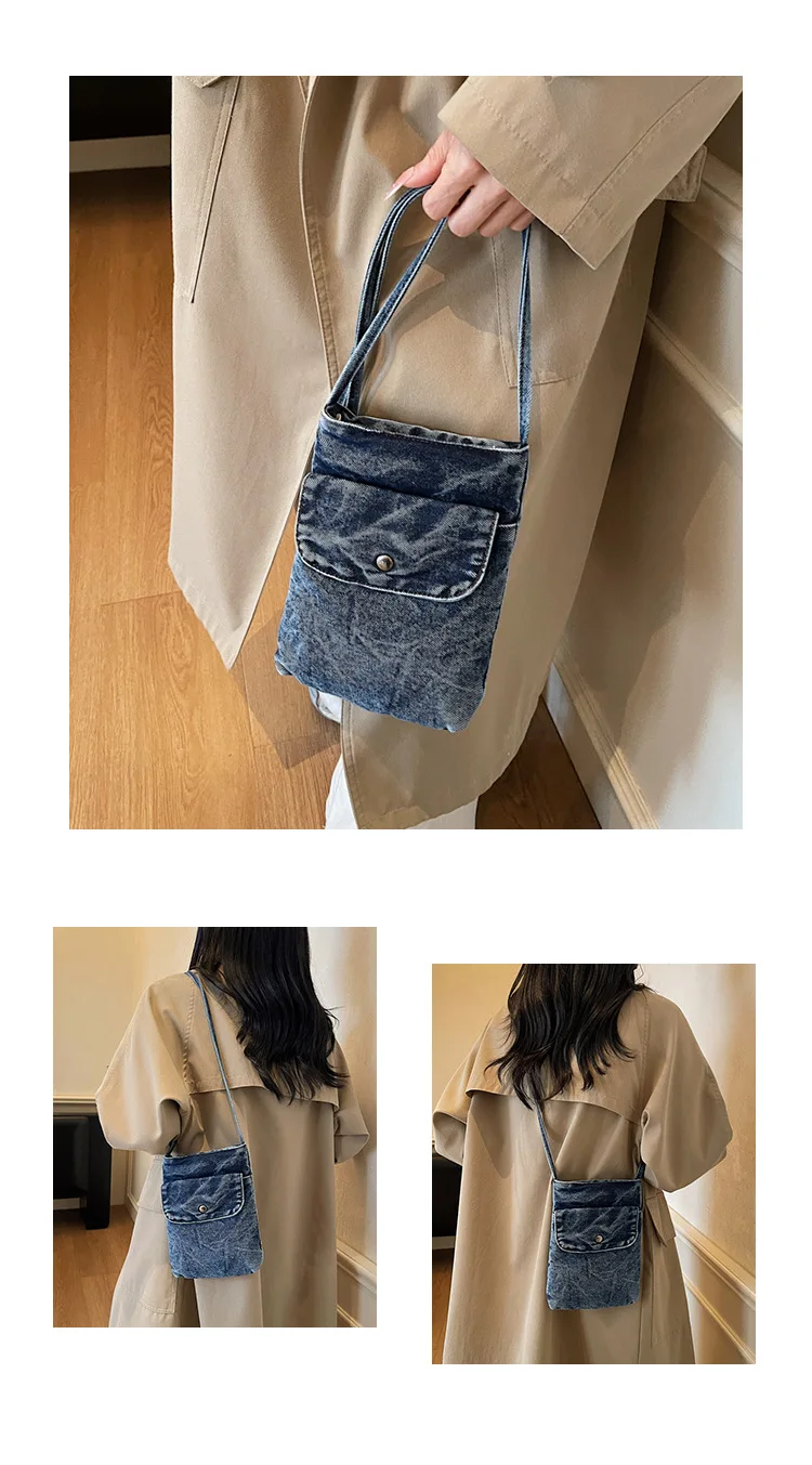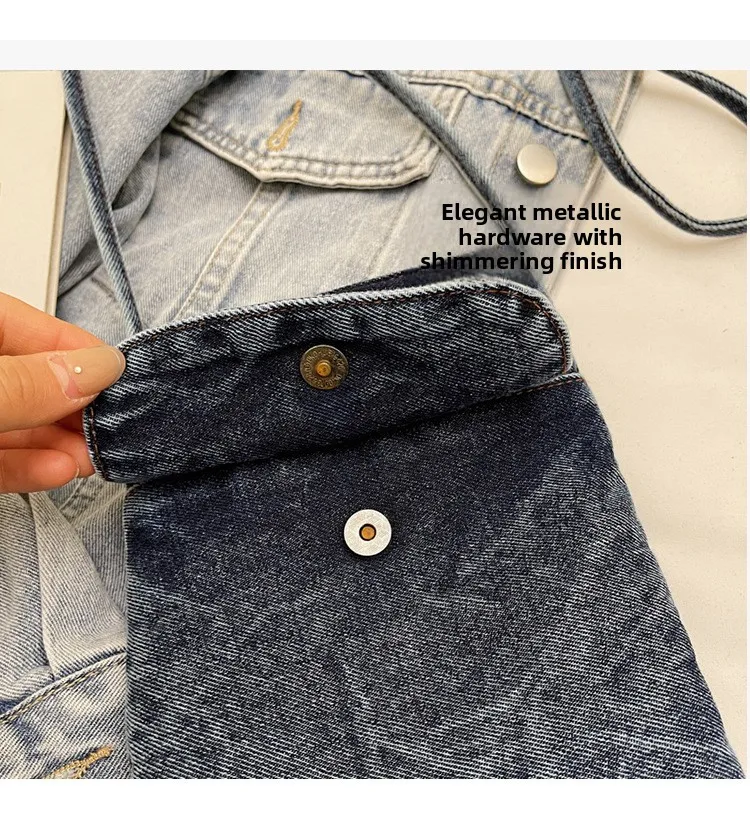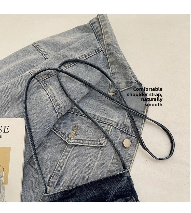 Esta bolsa jeans feminina apresenta um estilo minimalista urbano, perfeita para quem prefere uma estética elegante e simples.