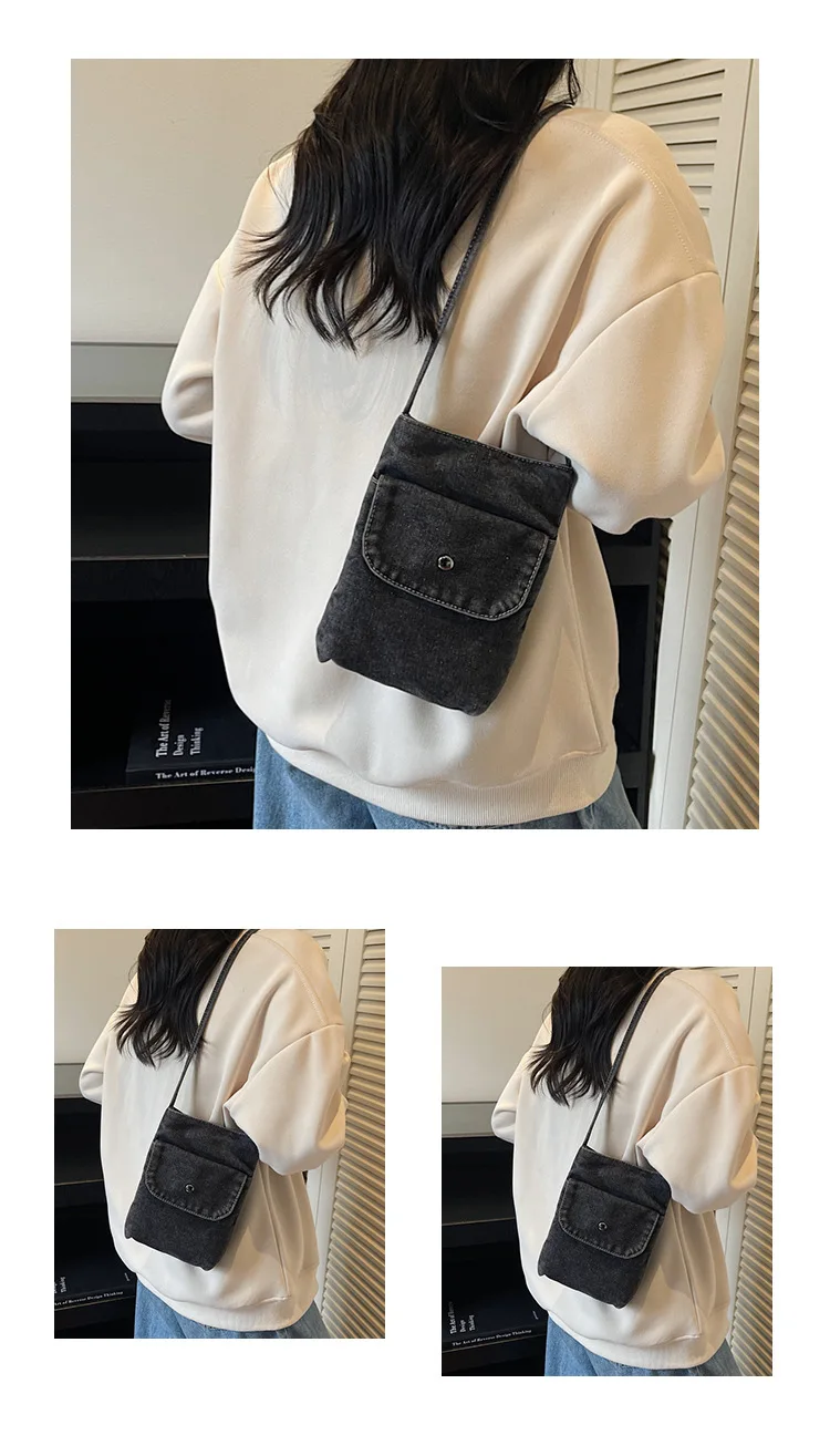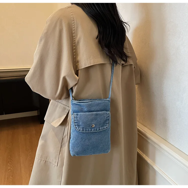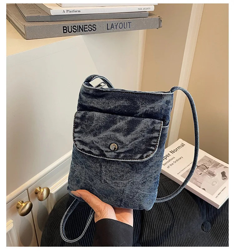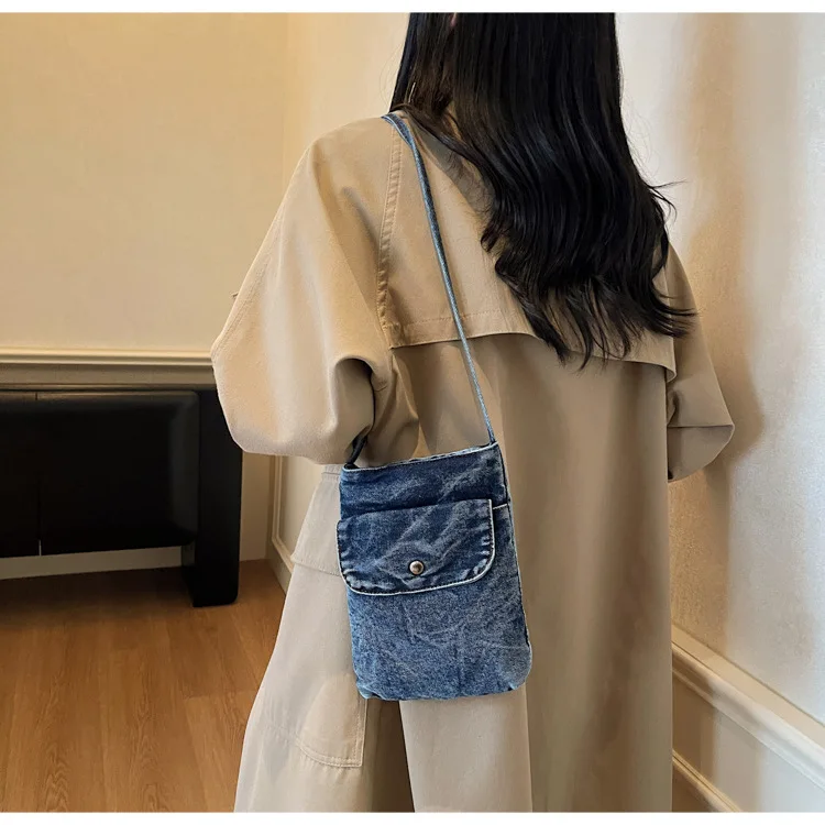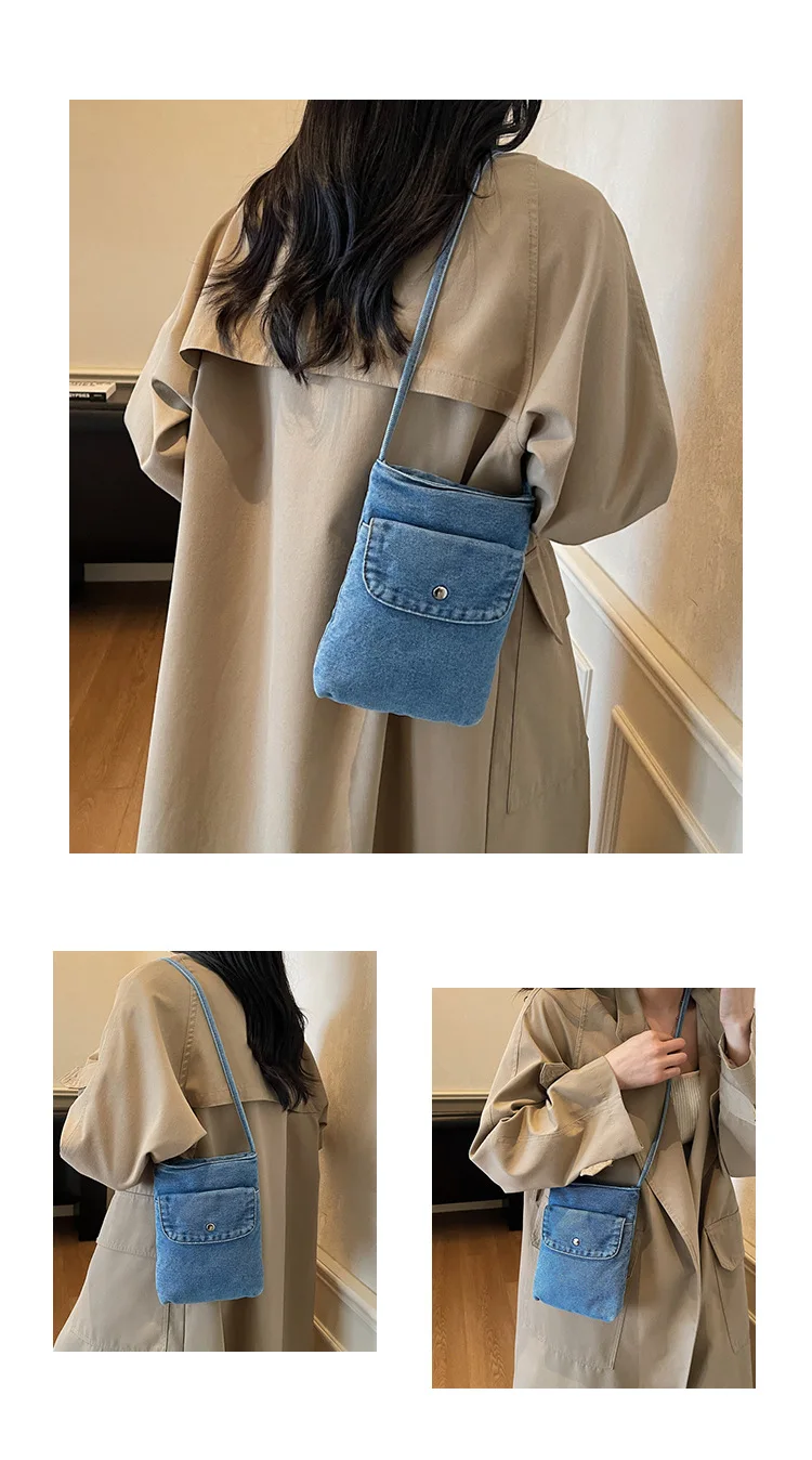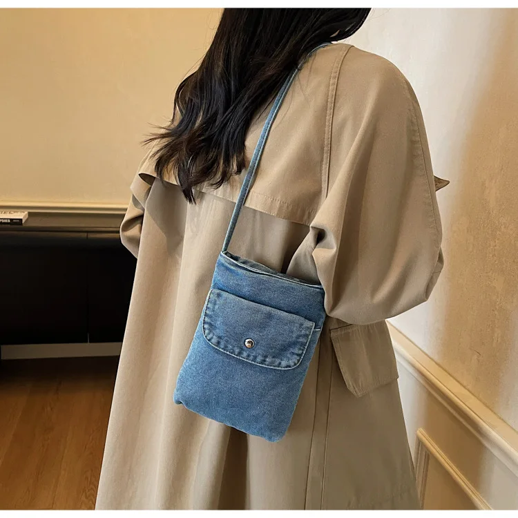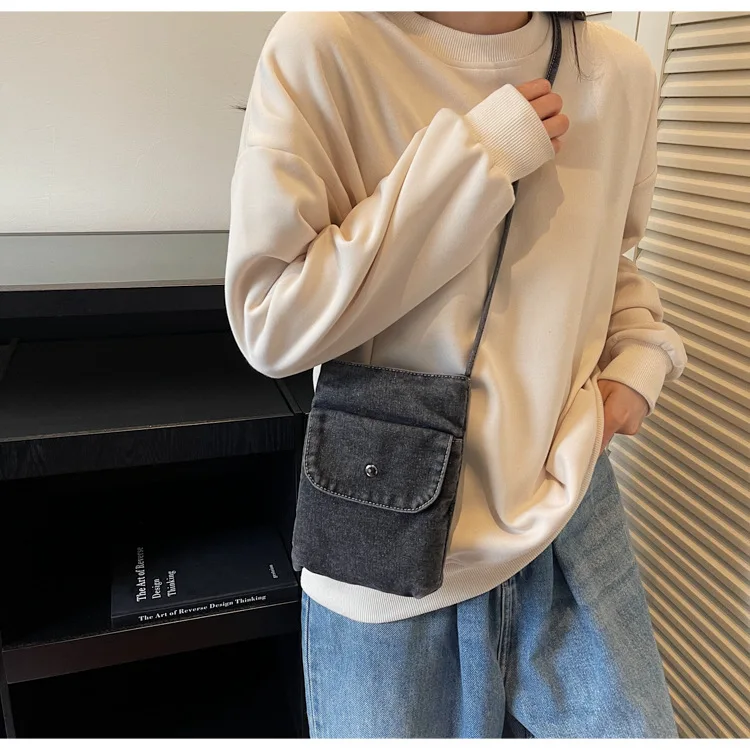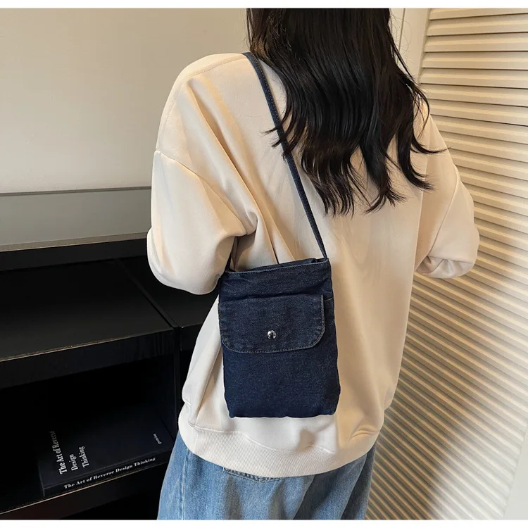 Esta bolsa jeans feminina apresenta um estilo minimalista urbano, perfeita para quem prefere uma estética elegante e simples.