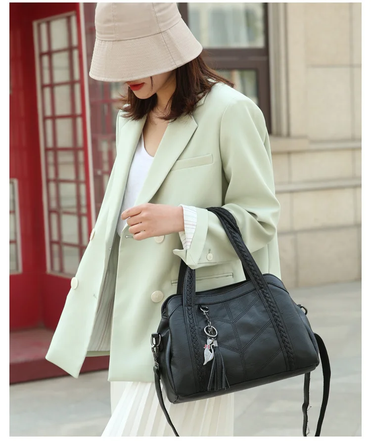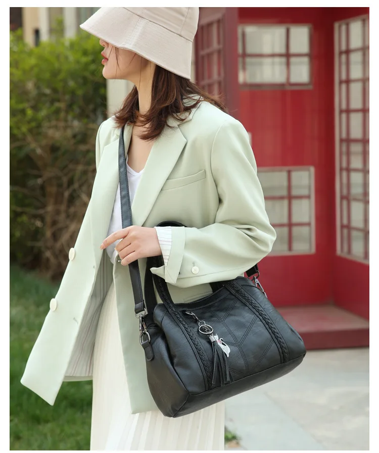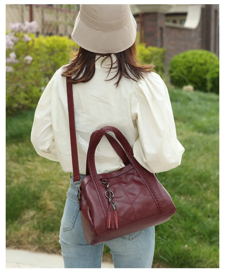 Com três alças, esta bolsa pode ser carregada como bolsa de mão, bolsa de ombro ou crossbody, oferecendo versatilidade.