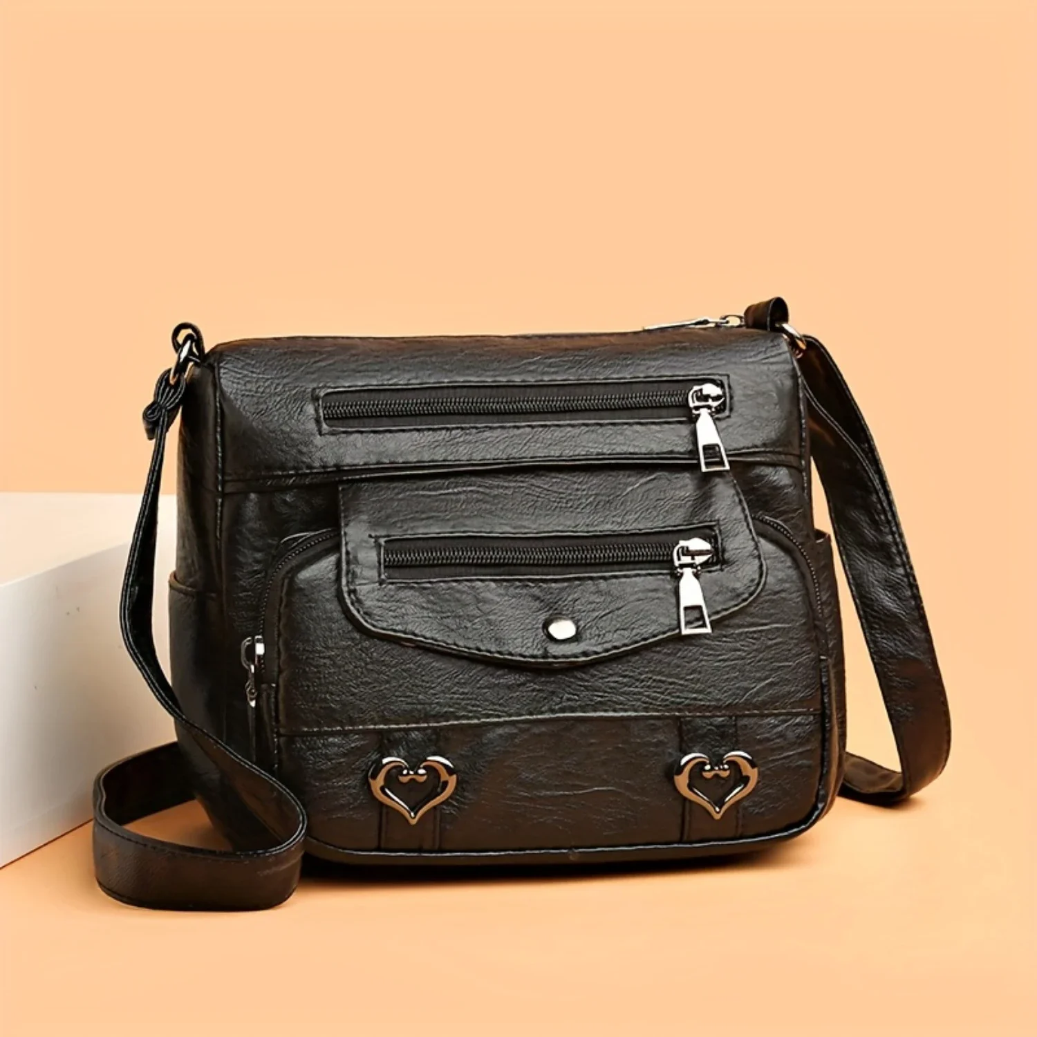 1.Esta bolsa crossbody retrô com vários bolsos é um acessório elegante e versátil para qualquer mulher em movimento.Feita com couro sintético macio e com uma bolsa decorada com coração, esta bolsa de ombro é moderna e elegante.Com alças fixas e fecho de zíper seguro, é perfeito para uso diário ou ocasiões especiais.