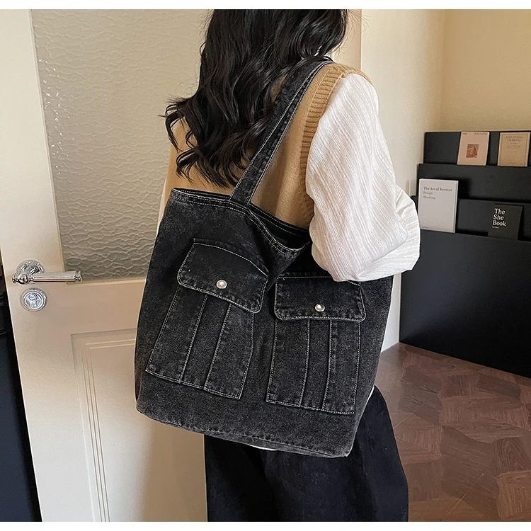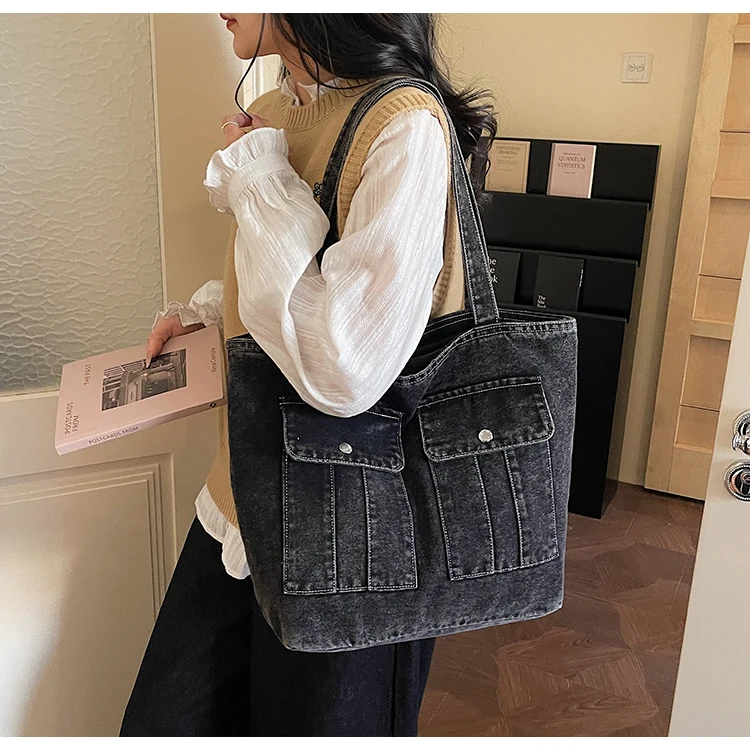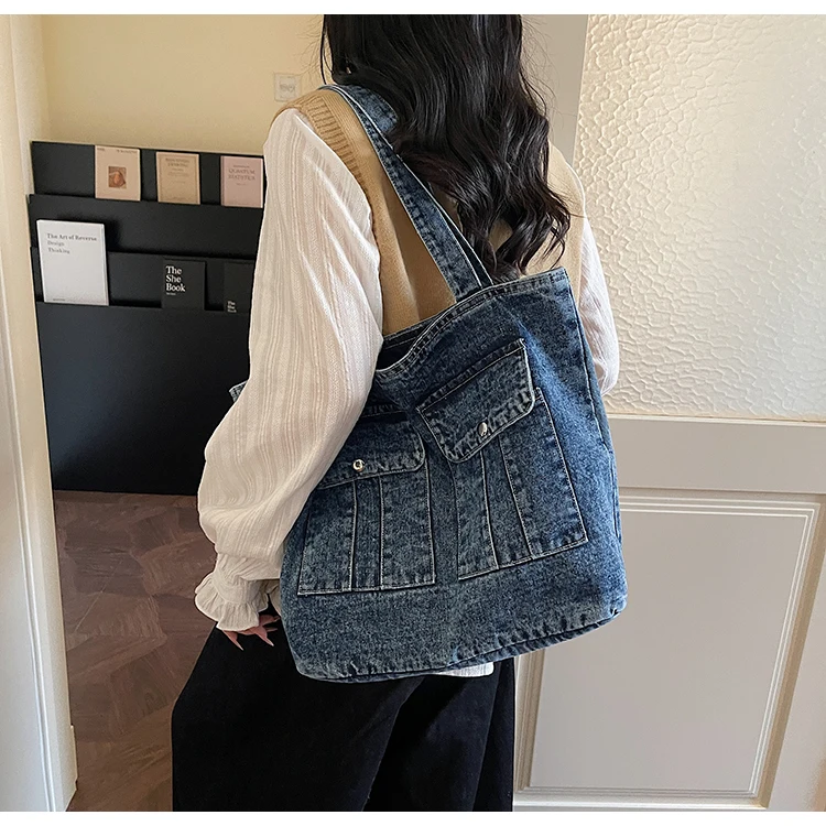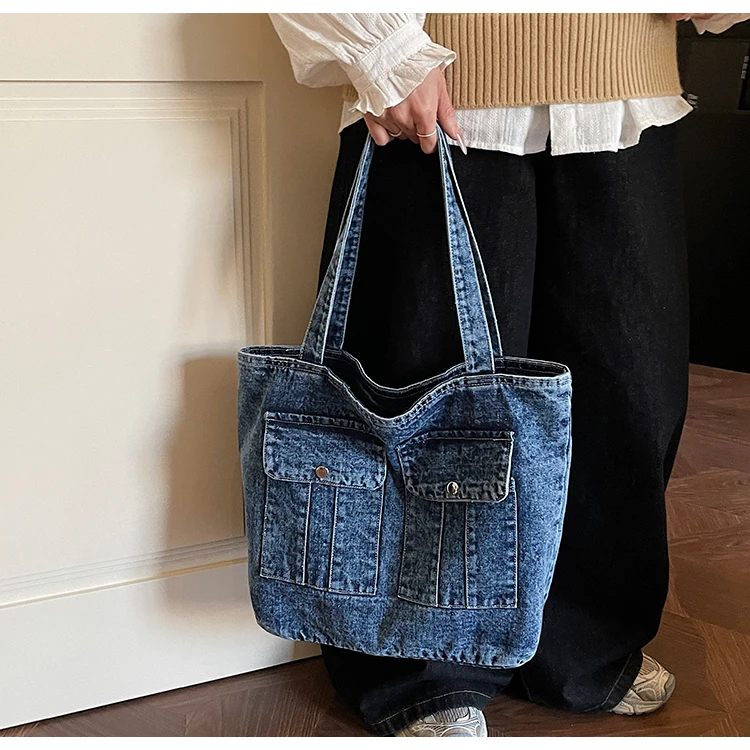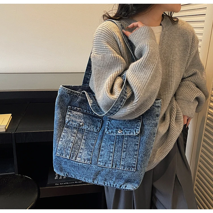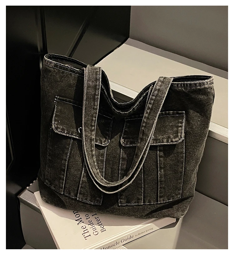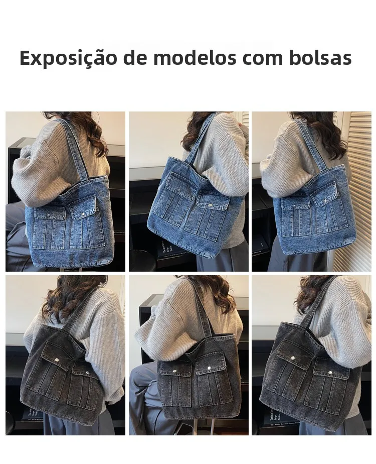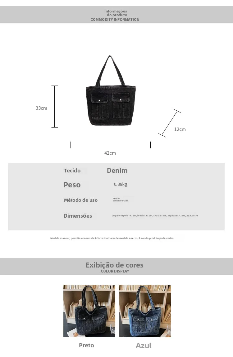 Feito de jeans, este saco de compras é durável e resistente, perfeito para uso diário.