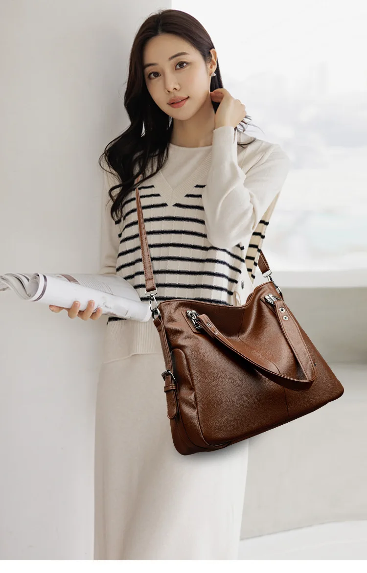 Para mulheres que precisam levar a vida na bolsa, apresentamos a nossa Bolsa Feminina Grande Espaçosa e Moderna. A combinação perfeita entre funcionalidade e sofisticação. Com espaço generoso, ela é ideal para acomodar o seu portátil (notebook), cadernos, nécessaire e tudo o que a sua rotina agitada exige.
