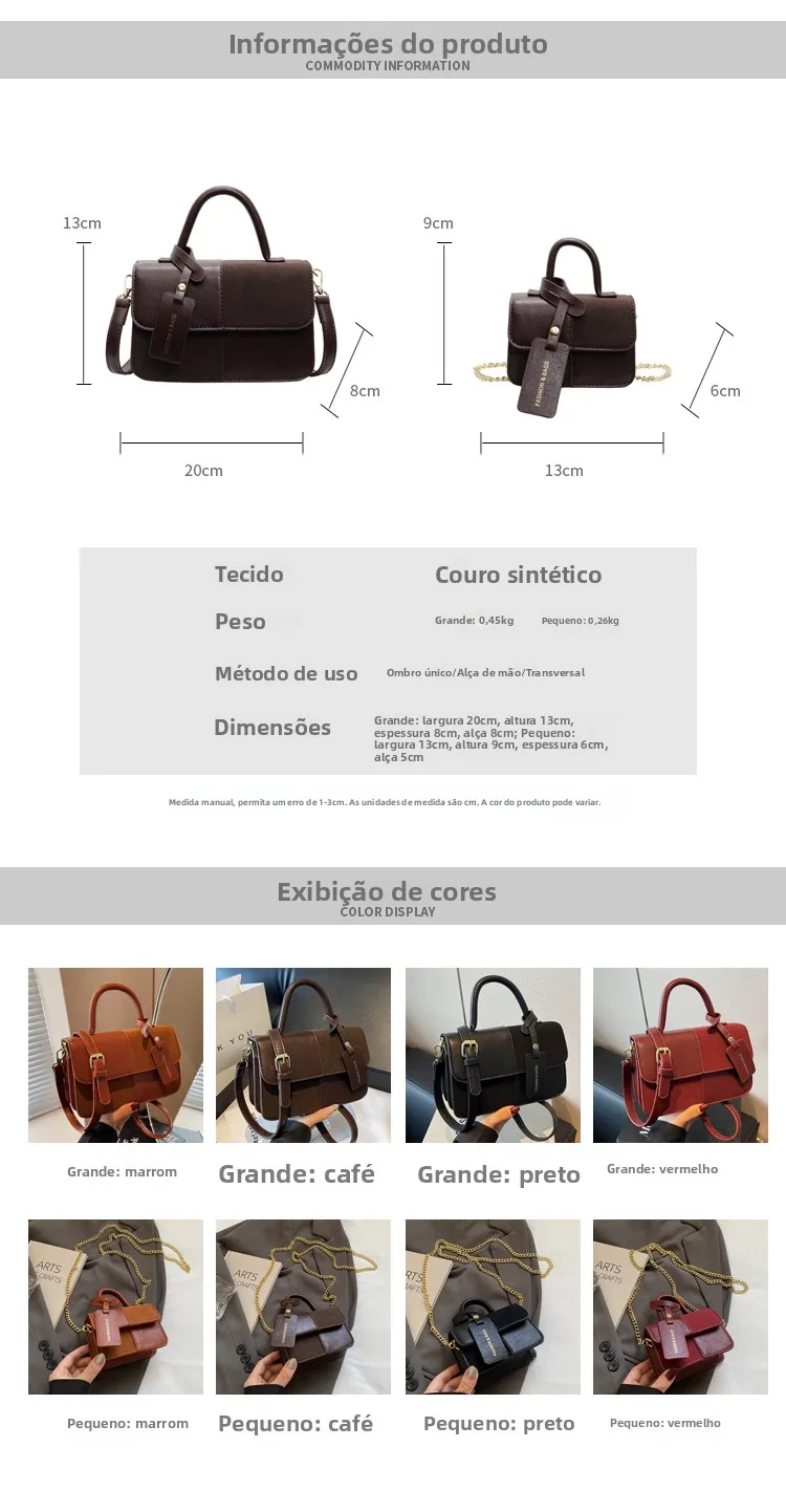 Com um tamanho compacto, esta bolsa é fácil de transportar e adequada para quem prefere um estilo mais minimalista.