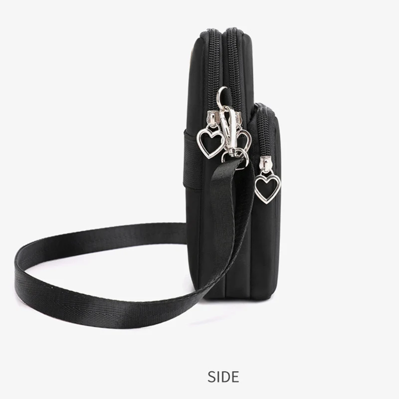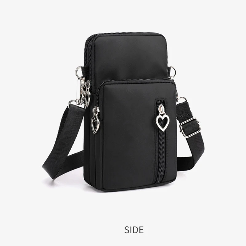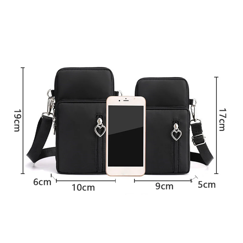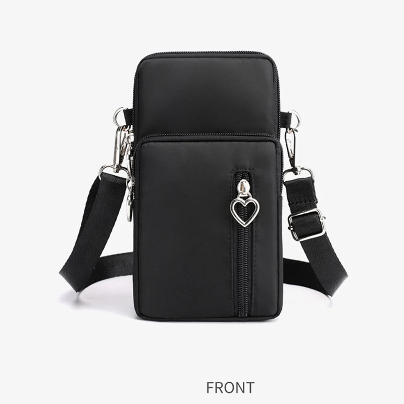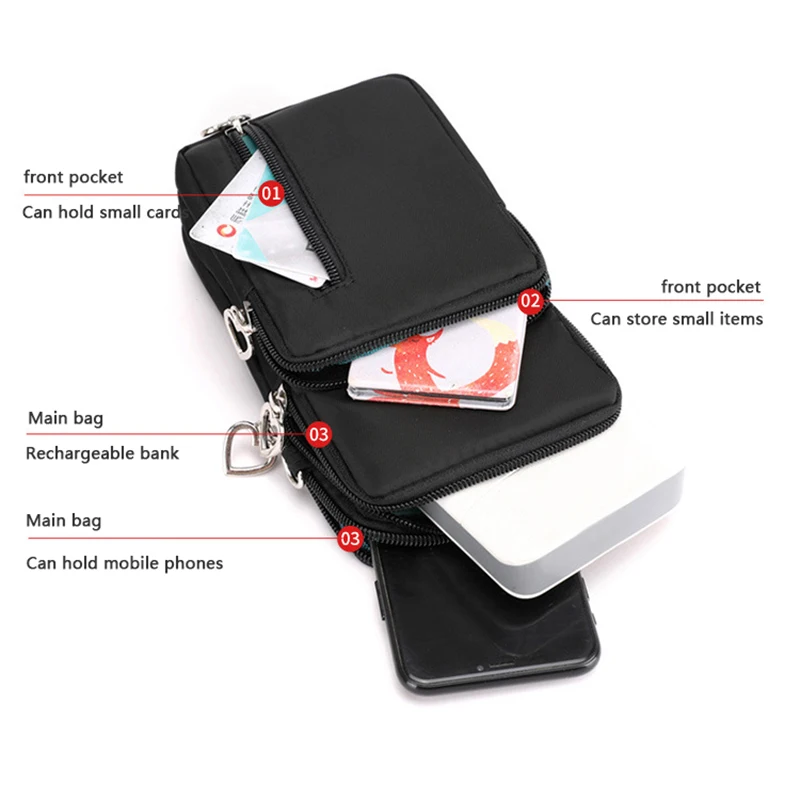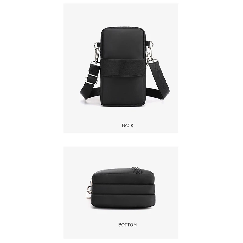 Design de três compartimentos, zíper suave, design de alça larga, pode ser usado no ombro, pulso, braço, pescoço, tecido Oxford, bolsa grande pode conter telefones celulares abaixo de 7,2 polegadas e bolsas pequenas podem conter telefones celulares abaixo de 6,5 polegadas.