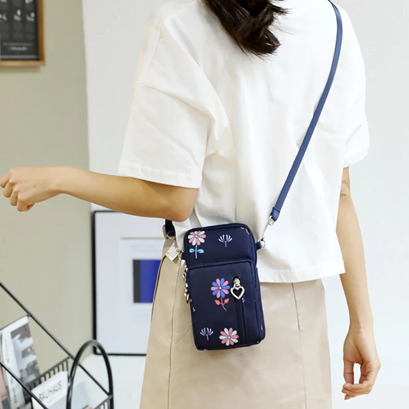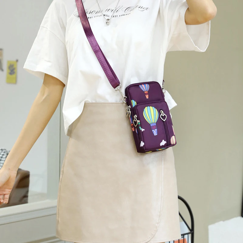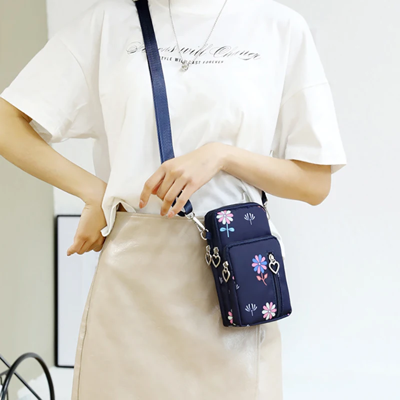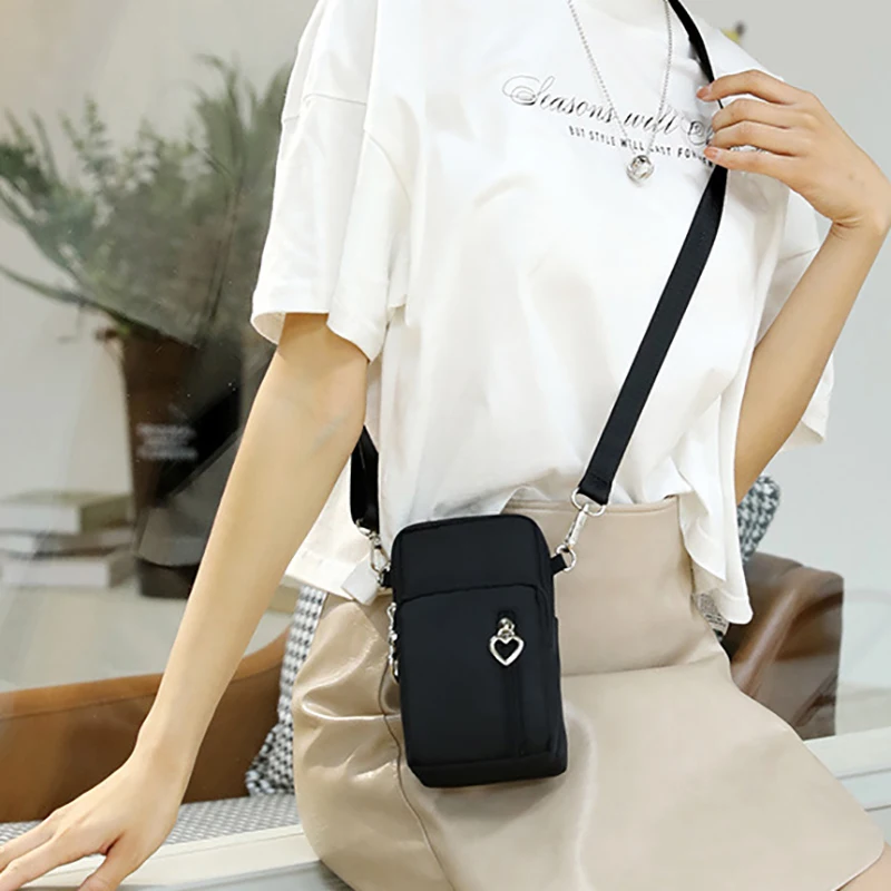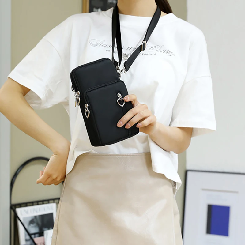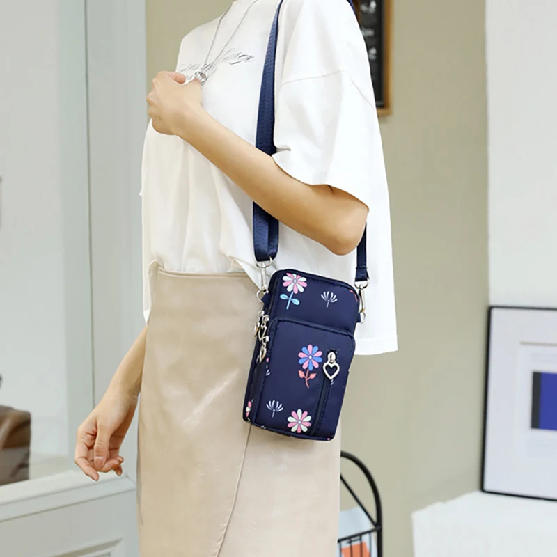 Design de três compartimentos, zíper suave, design de alça larga, pode ser usado no ombro, pulso, braço, pescoço, tecido Oxford, bolsa grande pode conter telefones celulares abaixo de 7,2 polegadas e bolsas pequenas podem conter telefones celulares abaixo de 6,5 polegadas.