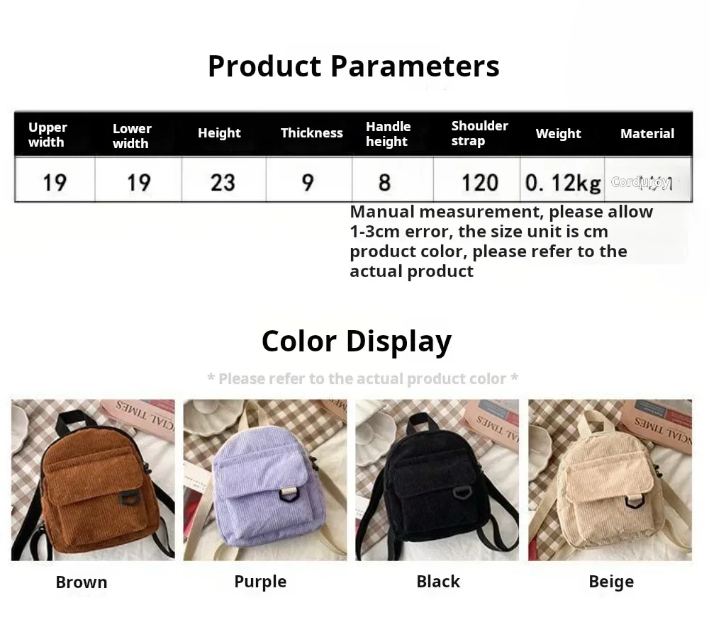 • Material de Veludo Cotelê DurávelFeita com veludo cotelê de alta qualidade, esta mochila oferece durabilidade e longevidade superiores, perfeita para o uso diário.