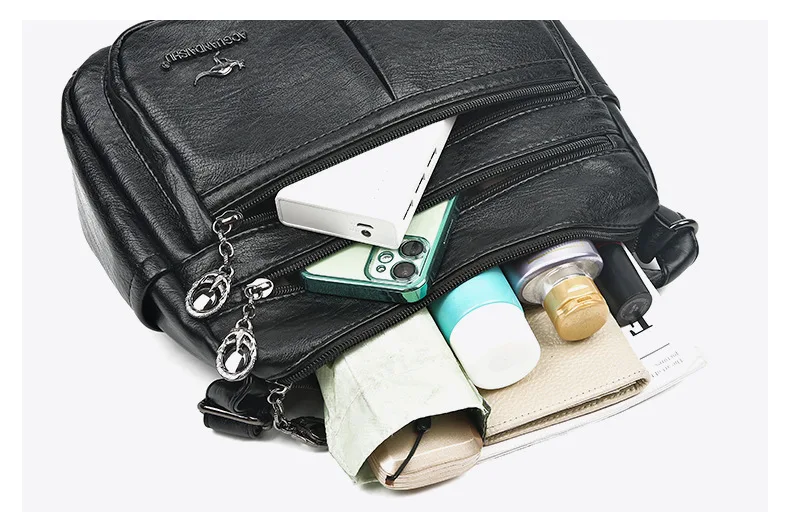 Equipado com vários compartimentos, incluindo um bolso para telefone e um bolso oculto com zíper, foi projetado para ser prático.