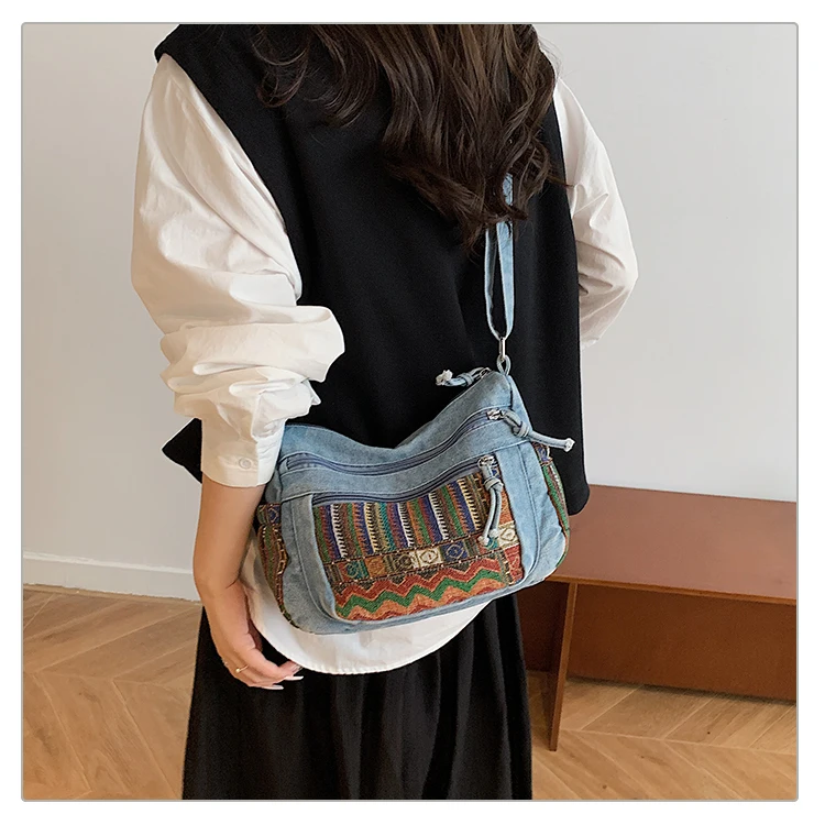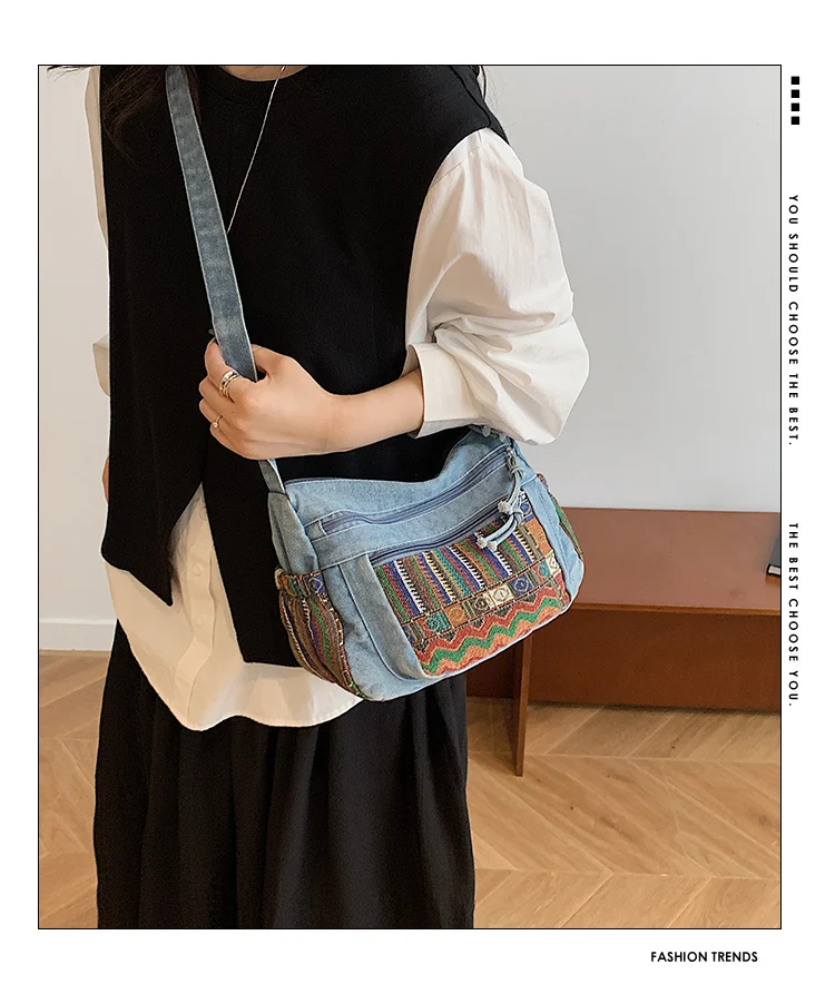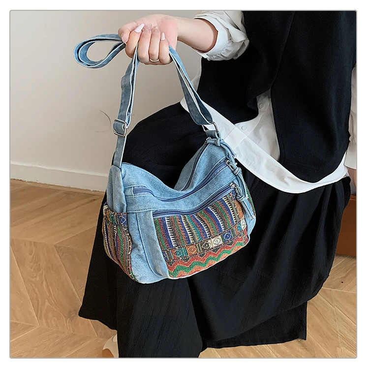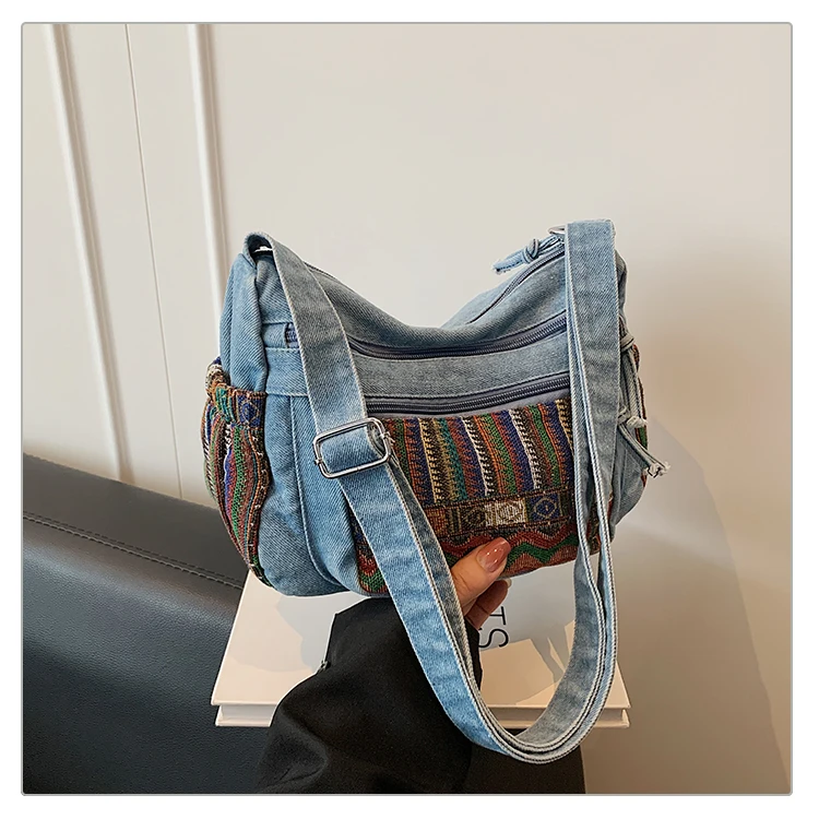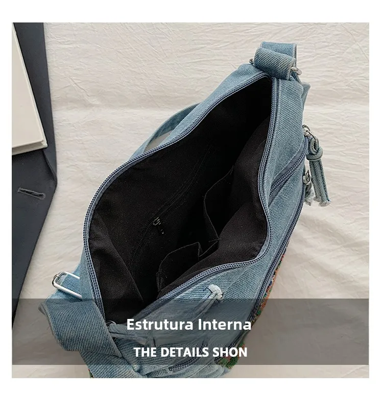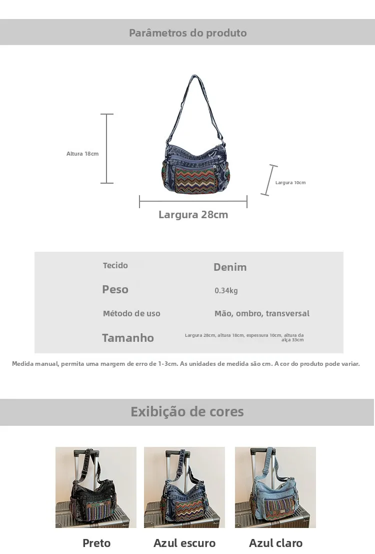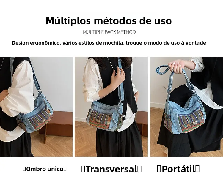 Feito de lona de jeans, este saco é durável e resistente, ideal para uso diário.