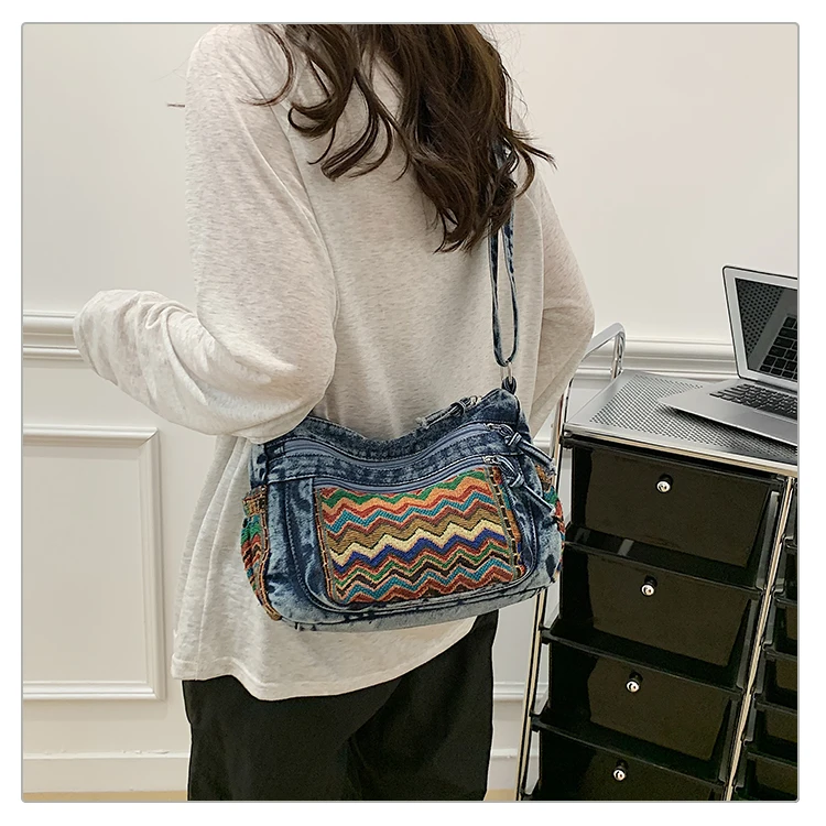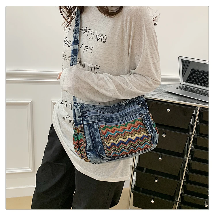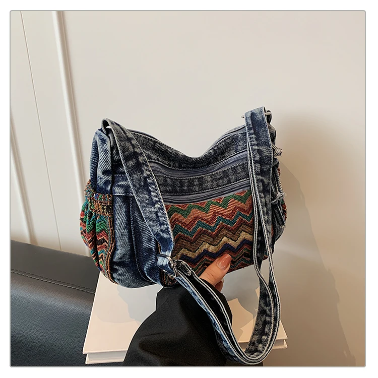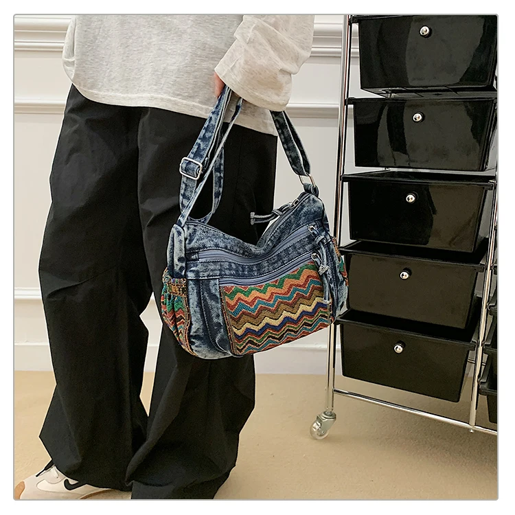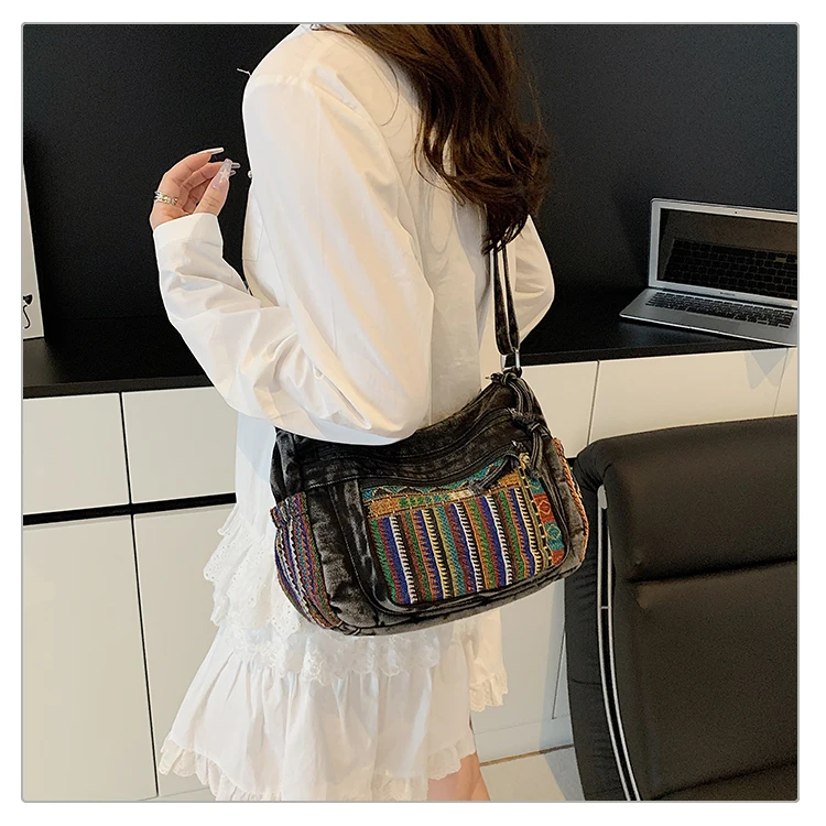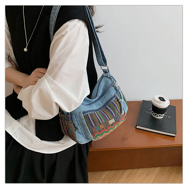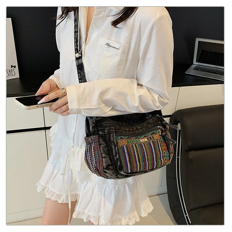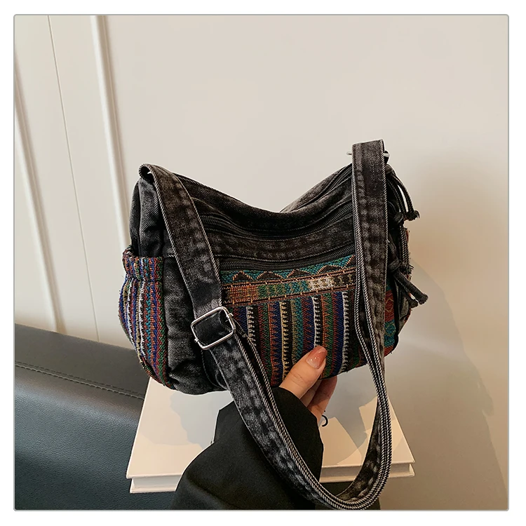 Feito de lona de jeans, este saco é durável e resistente, ideal para uso diário.
